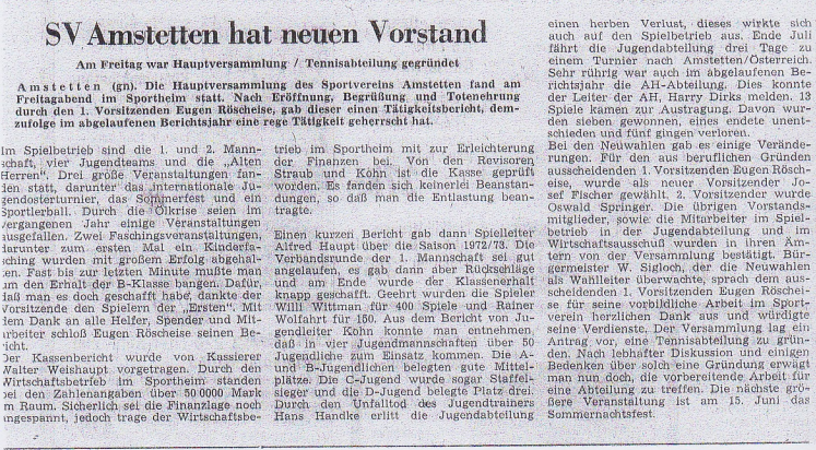Neuer Vorstand und Tennisabteilung: In der Hauptversammlung von 1974 war so einiges los. Josef Fischer wurde zum 1. Vorsitzenden gewählt und nach intensiver Diskussion entschied man sich für die Gründung der Tennisabteilung. Mit dieser Sparte werden wir uns dann in der nächsten Geschichtsstunde befassen.