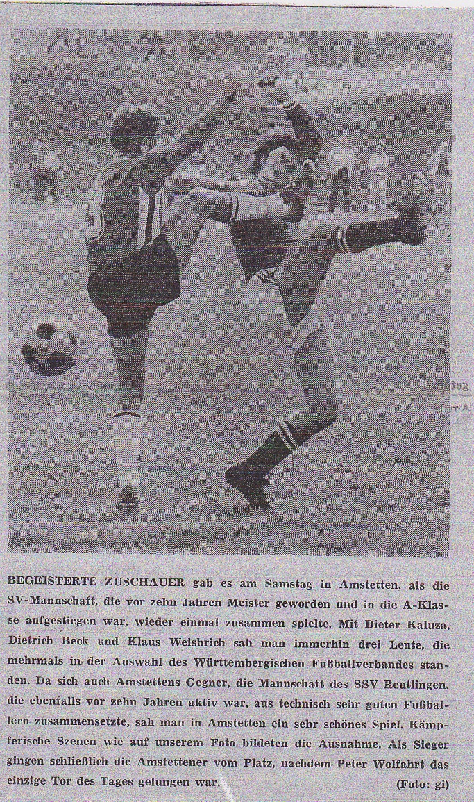 Sieg gegen Reutlingen: Zurück zum Fußball und dem Freundschaftsspiel gegen den Erstamateurligisten SSV Reutlingen im Juni 1971. In diesem Spiel nach Saisonende vor ca. 500 Zuschauern konnte Amstetten mit einem Sieg gegen den haushohen Favoriten überraschen. Den Spielbericht sowie ein paar Ablichtungen haben wir Euch beigefügt. Respektable Leistung.