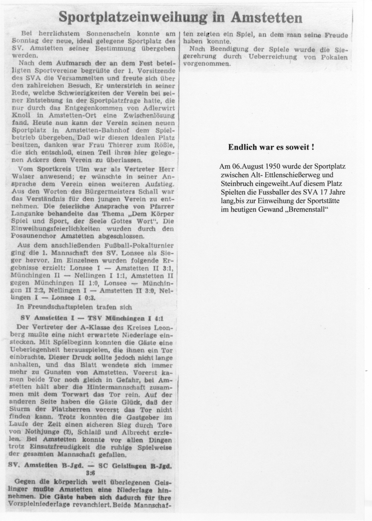 1. Verbandsspiel auf dem neuen Sportplatz am Steinbruch am 03. September 1950 SV Amstetten – FC Neenstetten (3:1)