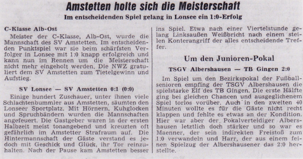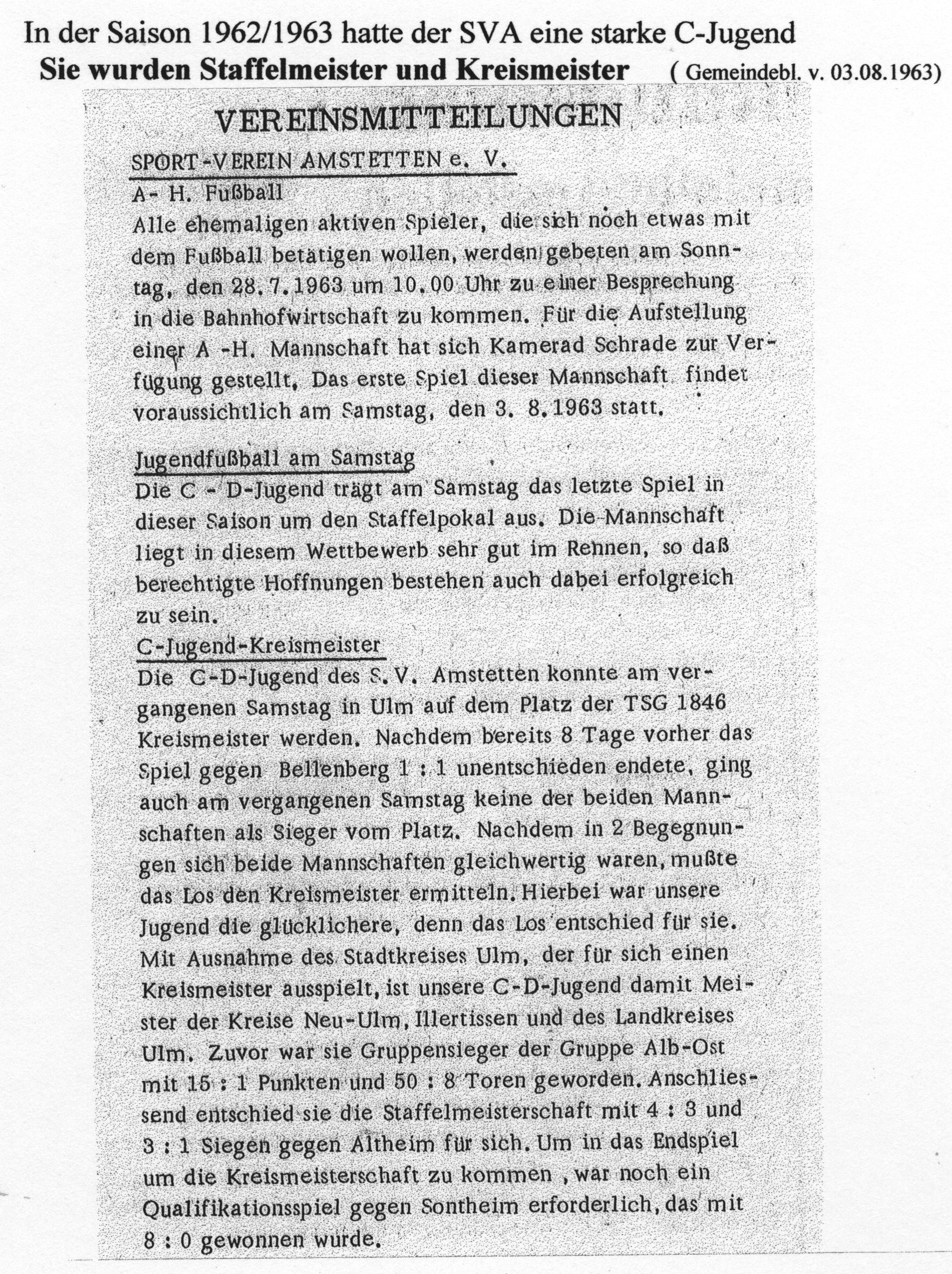 Galerie der Meister: wie im letzten Geschichtsteil versprochen geht es weiter mit unseren Meistern. Die C-Junioren des SVA wurden in der Saison 1962 -1963 Kreismeister und in der Saison 1963 – 1964 Staffelmeister. Leider haben wir hier bisher kein Bildmaterial vorliegen das wir liefern können. Die Spielernamen müssten jedoch passen. Lediglich die Urkunden liegen uns vor die im Sportheim betrachtet werden können. Einen kleinen Artikel zu den Meisterschaften der C-Jugend brachte unser Archiv dennoch hervor.
