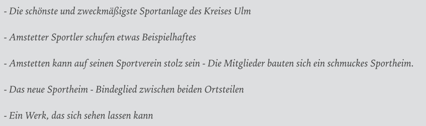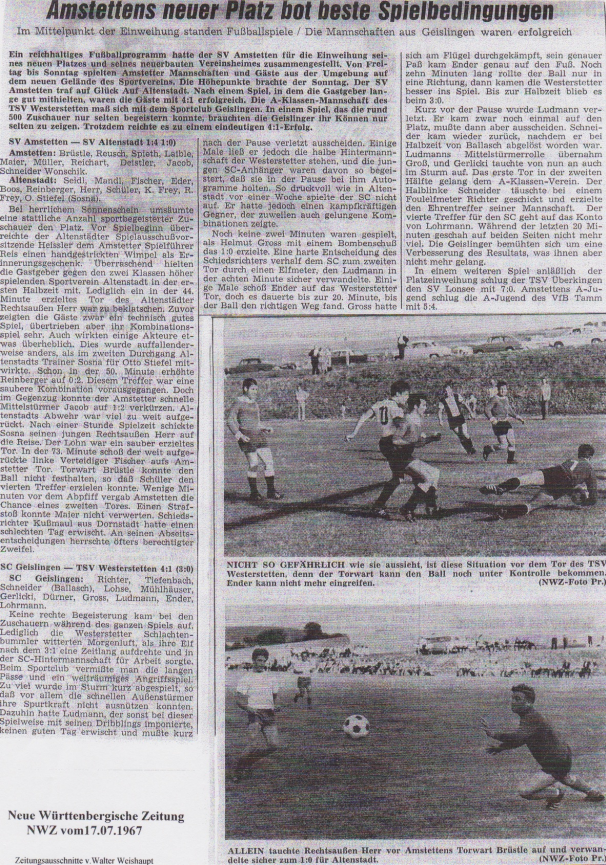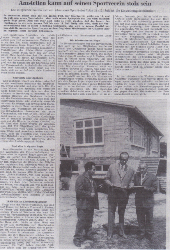 Das neue Vereinsheim und Einweihung: 10. Juli 1967 – „Großes Werk gedeiht nur durch Einigkeit“ – Dieser Satz dürfte als Leitwort über der großen Veranstaltung des SVA zur offiziellen Übergabe von Sportplatz und der Fertigstellung des neuen Sportheims gestanden haben. Insgesamt 128 freiwillige Helfer und gesamt 5426 Stunden haben dieses Werk vollbracht. Für diese tolle Leistung müssen wir heute noch dankbar sein. Neben zwei großen Festabenden, Fußballspielen, Musik, Vorträgen und Künstlern von Rundfunk und Fernsehen wurde dieses Ereignis gebührend abgeschlossen. In vielen Gazetten wurde über den Bau und dieses Event geschrieben. Hier einige eindrucksvolle Schlagzeilen daraus sowie einen Zeitungsartikel zu den Fußballspielen auf dem neuen Sportplatz.