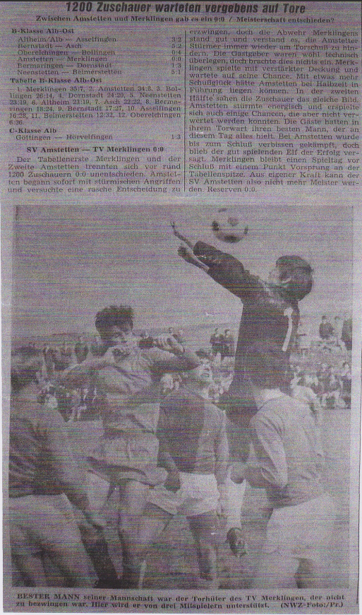 Die verpasste Meisterschaft: Nach der Meisterschaft der Saison 1967 – 1968 wurde die 1. Mannschaft des SVA in der kommenden Saison fast wieder Meister. Das entscheidende Spiel daheim gegen den Tabellenersten TV Merklingen vor 1200 Zuschauern endete unglücklich 0:0 und die Meisterschaft ging an Merklingen verloren. Amstetten war in diesem Spiel getrieben von der fantastischen Kulisse die deutlich bessere Mannschaft aber die Abwehr des Wettbewerbers hielt bis zum Spielende den Angriffen der Amstetter stand. Den spannenden Zeitungsbericht und ein paar tolle Fotos zu diesem Spektakel haben wir Euch selbstverständlich bereitgestellt.