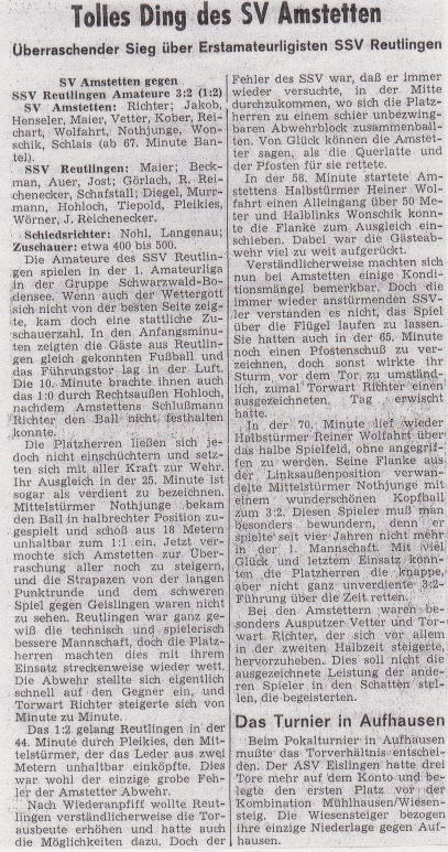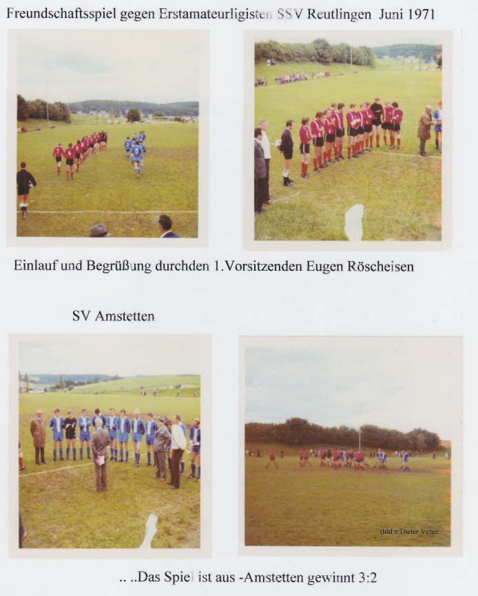 Sieg gegen Reutlingen: Zurück zum Fußball und dem Freundschaftsspiel gegen den Erstamateurligisten SSV Reutlingen im Juni 1971. In diesem Spiel nach Saisonende vor ca. 500 Zuschauern konnte Amstetten mit einem Sieg gegen den haushohen Favoriten überraschen. Den Spielbericht sowie ein paar Ablichtungen haben wir Euch beigefügt. Respektable Leistung.